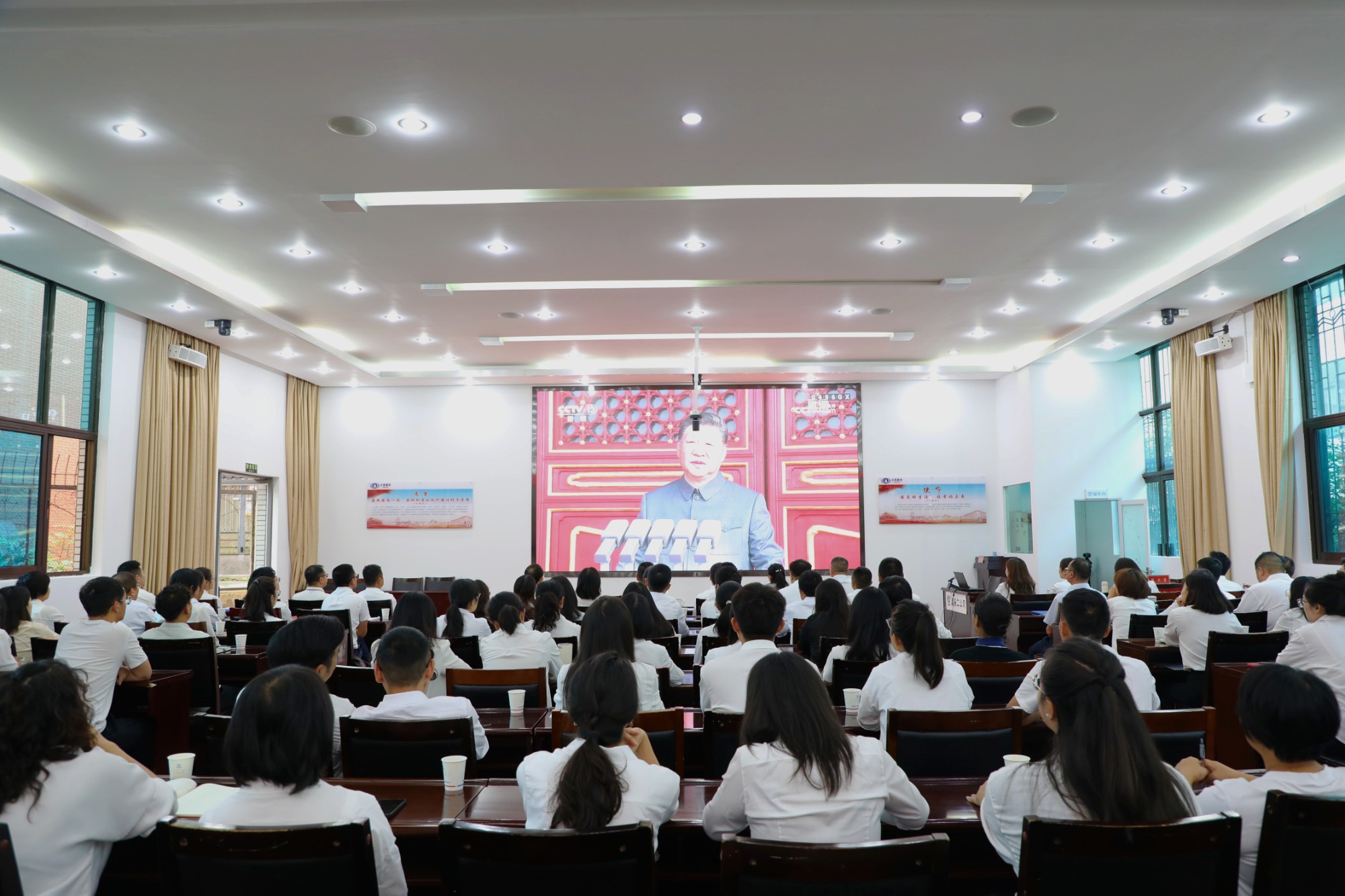 公司本部全体干部职工在一楼会议室集中收看,临沧公司、西北区域总部以及22个基层单位、101个在建项目分别在办公室、项目部收看直播,覆盖公司1400余名干部职工。