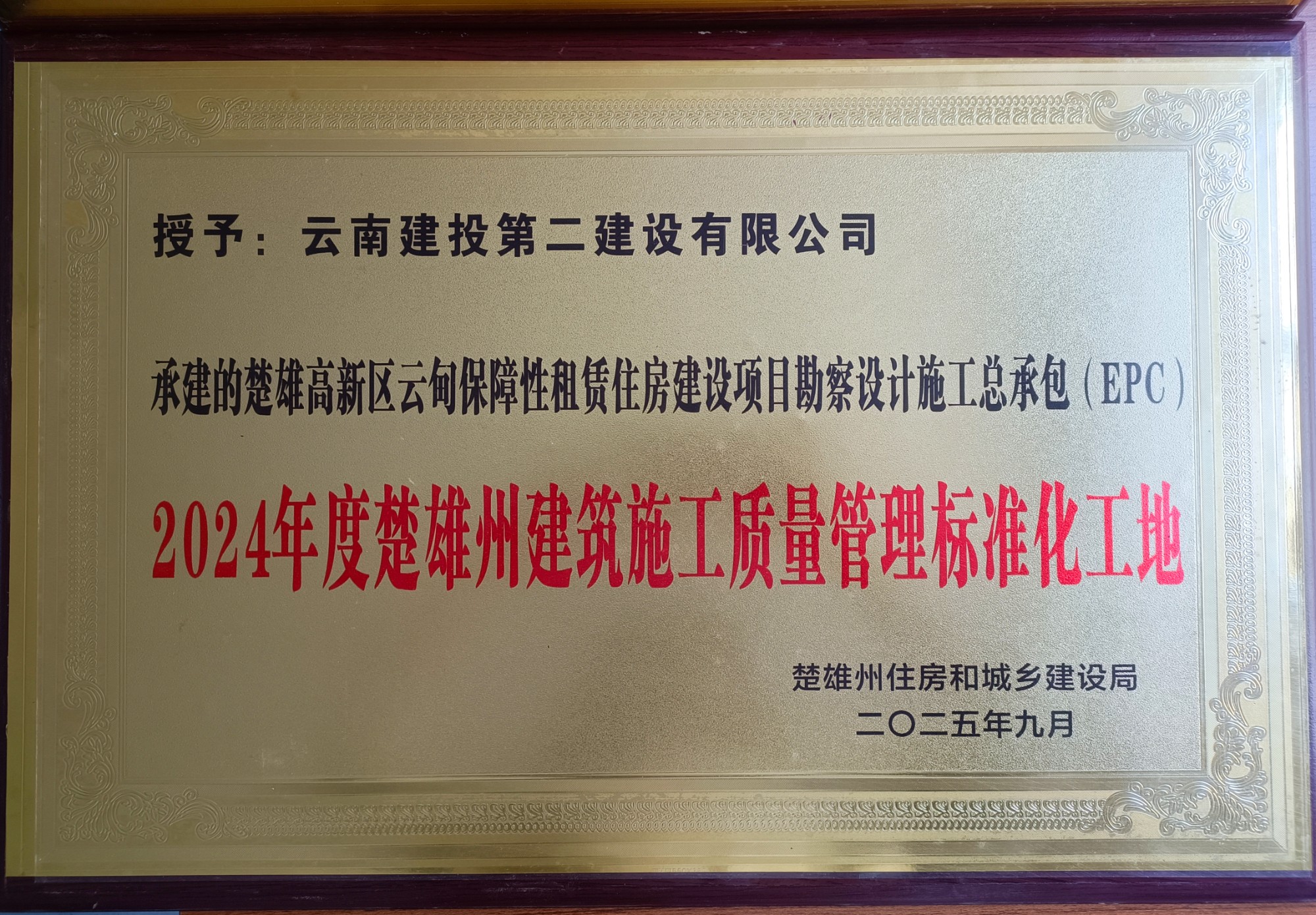 近日,楚雄州住房和城乡建设局发布了关于2024年度楚雄州建筑施工安全生产标准化和质量管理标准化工地的通报,公司楚雄高新区云甸保障性租赁住房建设项目荣获“2024年度楚雄州建筑施工质量管理标准化工地”称号。