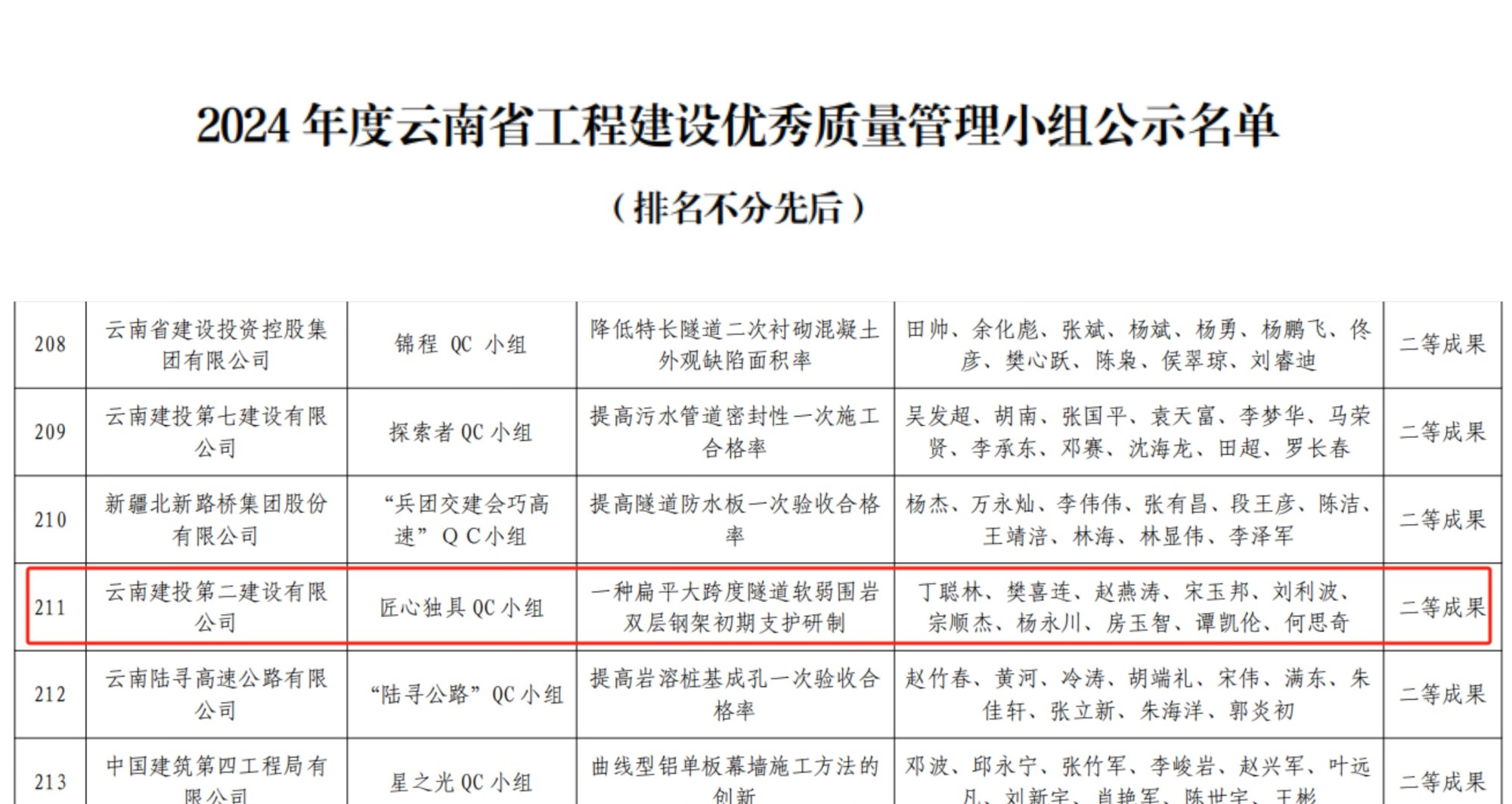 近日,第十九直管部匠心独具QC小组开展的课题“一种扁平大跨度隧道软弱围岩双层钢架初期支护研制”荣获省级QC二等成果。第十九直管部通过施工工艺总结行成的“桥梁满堂支撑脚手架高支模安全监测工法”荣获集团级工法。