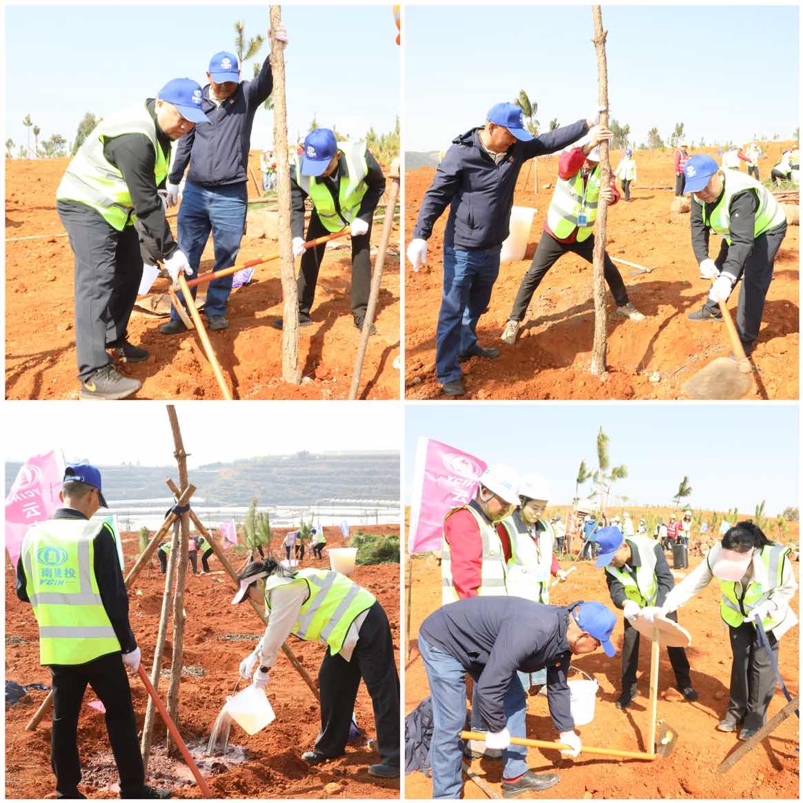 参加活动的干部职工们每六人一组,大家分工有序、协调配合,有的挥锹铲土,有的扶苗填坑,有的踏土夯苗,一丝不苟地完成每道工序,亲手种下一棵棵象征着希望和未来的树苗。不一会儿,60余棵云南松树苗便迎风挺立,青翠的绿色带来了春天的勃勃生机,装点着被黄土覆盖的山坡。