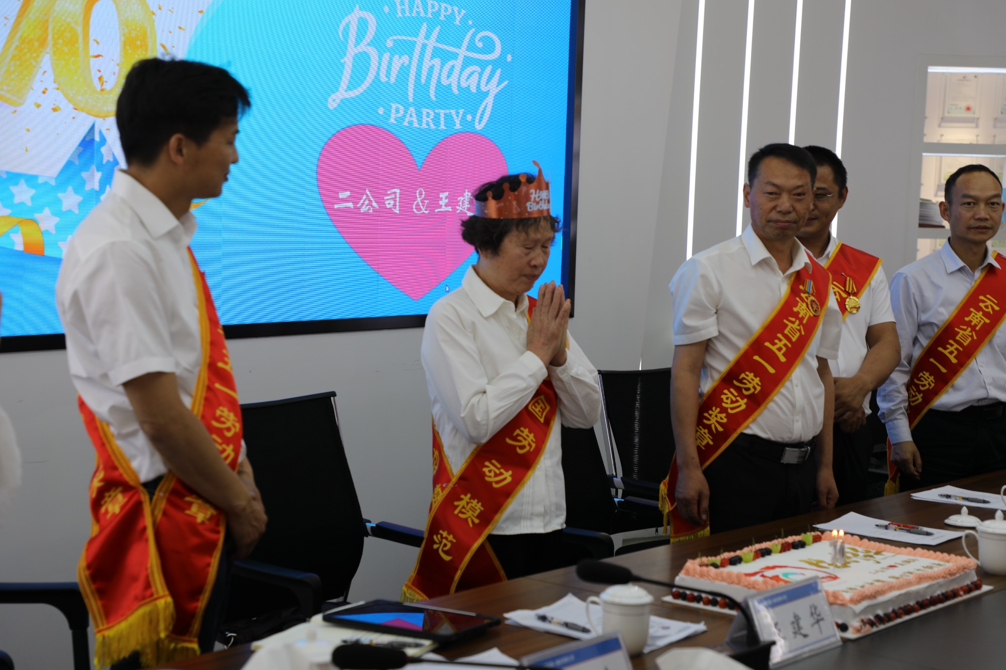 而此时,惊喜也在悄然而至,公司的暖心小厨早已把一切准备妥当。2023年是公司成立70周年,同时也是全国劳模王建华的70周岁生日。为庆祝公司成立70周年以及这位与公司同龄的杰出女性生日,公司精心准备了惊喜。当印有公司70周年主题logo和二公司&王建华的的方形大蛋糕被端上桌时,现场掌声雷动,温馨的氛围达到了顶点。闪亮的生日帽装点着王建华慈祥的面庞,在“祝你生日快乐,祝你生日快乐……”的歌声中,王建华双手合十许下愿望,她说:“我的生日愿望可以告诉大家,那就是祝福公司发展越来越好!”随后,巨大的蛋糕被分成了无数个小块,大家迫不及待地品尝起来,感受着从舌尖蔓延至内心的甜蜜。