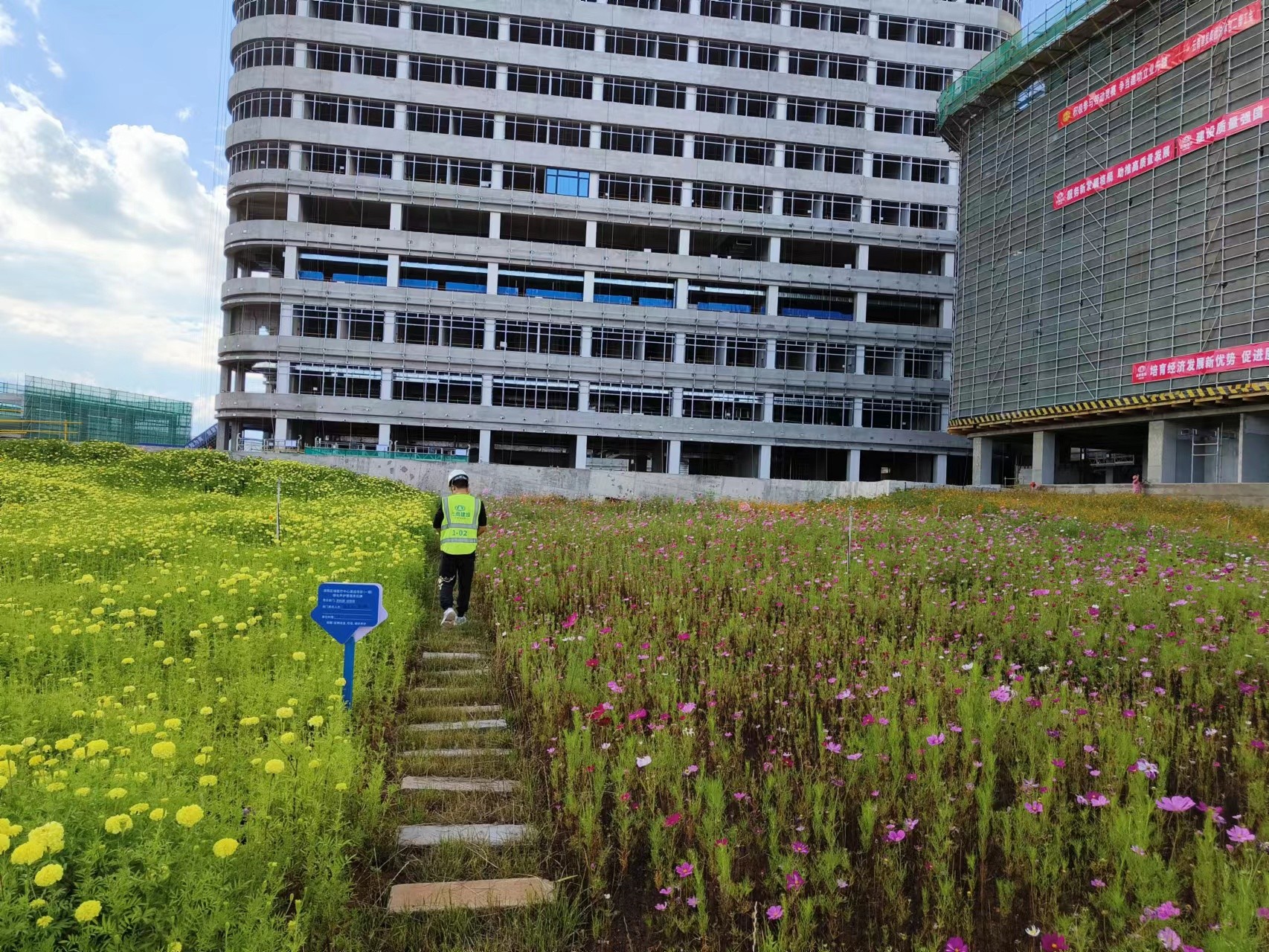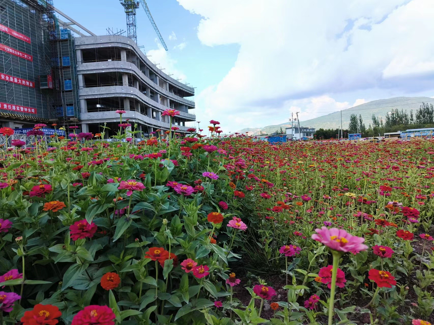 行走在滇西医疗中心项目施工现场,遍地可见百花争艳覆盖着裸露的地面,让人赏心悦目。据了解,这是滇西医疗中心一期项目文明施工、扬尘治理工作的一项新探索。应用种花抑尘新模式,将环境绿化升级为环境美化,折射着项目创建施工示范工地的决心。