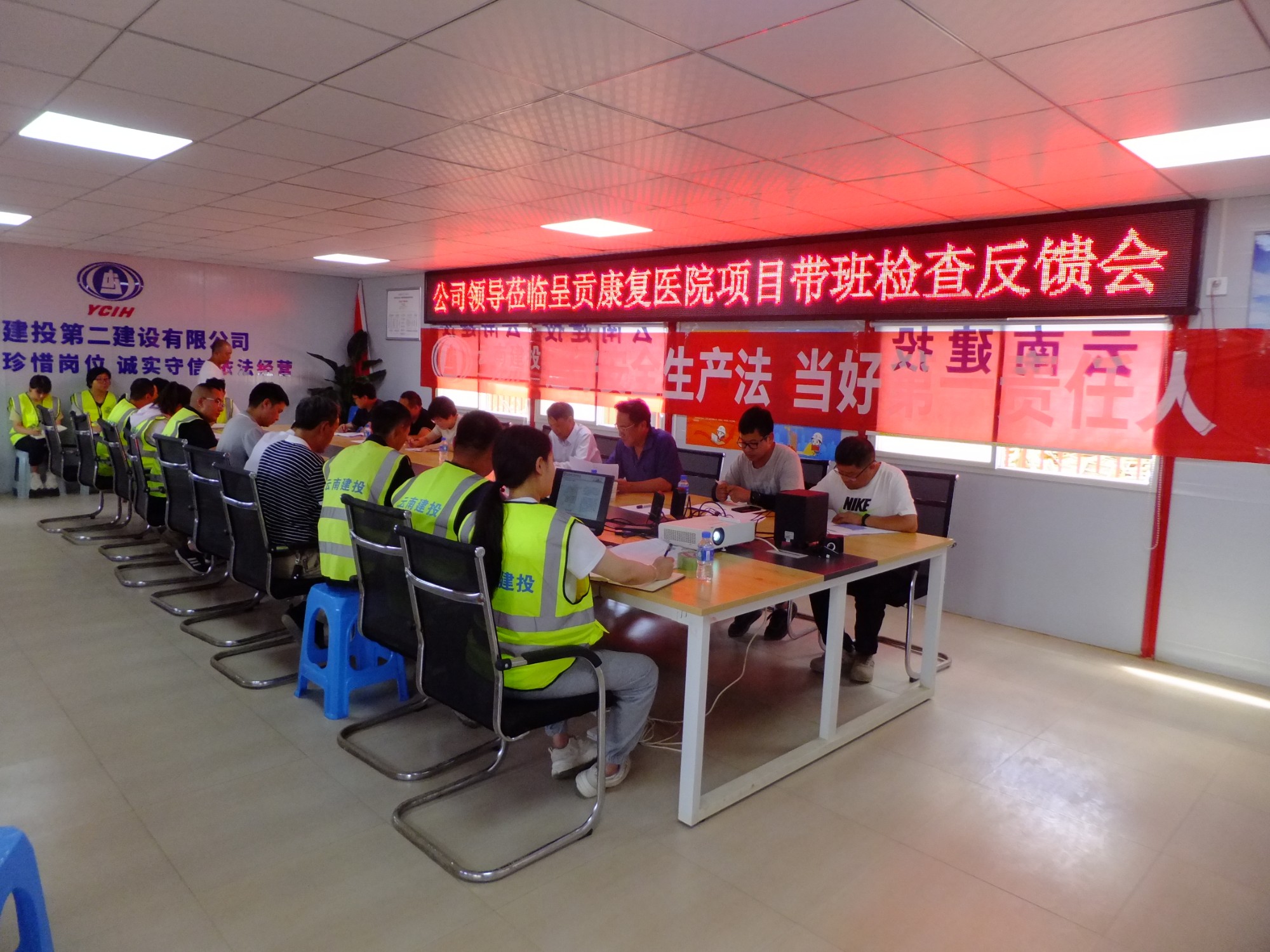 陈定华一行深入施工现场,对项目生产、安全、质量、技术、成本、材料、文明施工等进行了检查,各部门负责人对项目现场所存在的问题提出指导性帮扶意见,并召开检查反馈会。