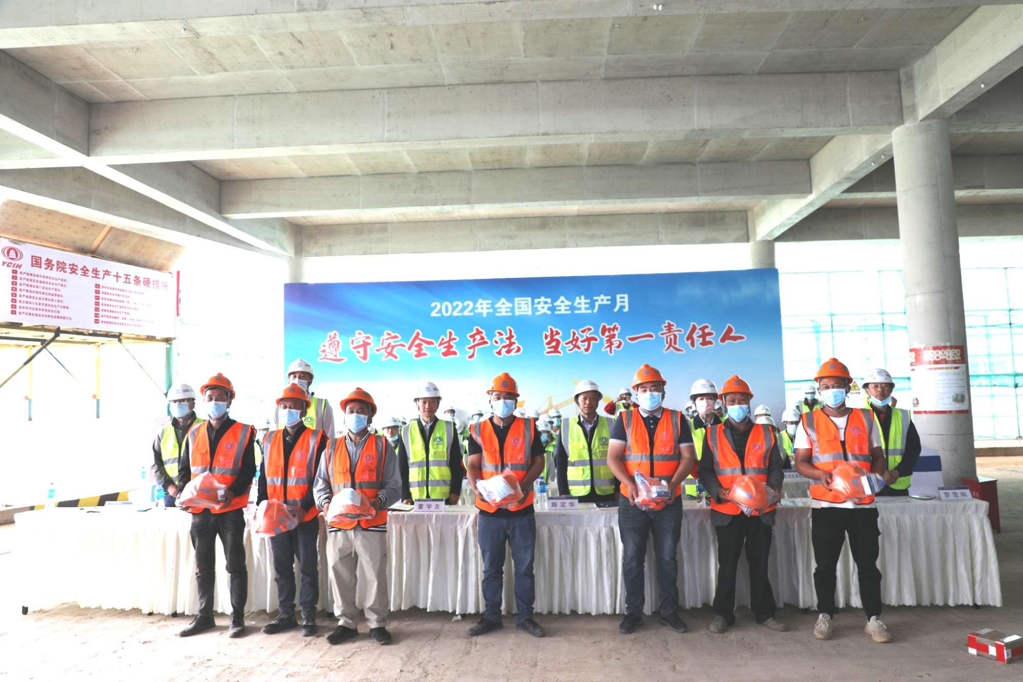 仪式上,与会领导为农民工代表发放安全防护用品;安全监督管理部副经理宣贯了公司《2022年“安全生产月”活动方案》;龙江小学项目经理代表公司全体项目经理作了安全倡议。