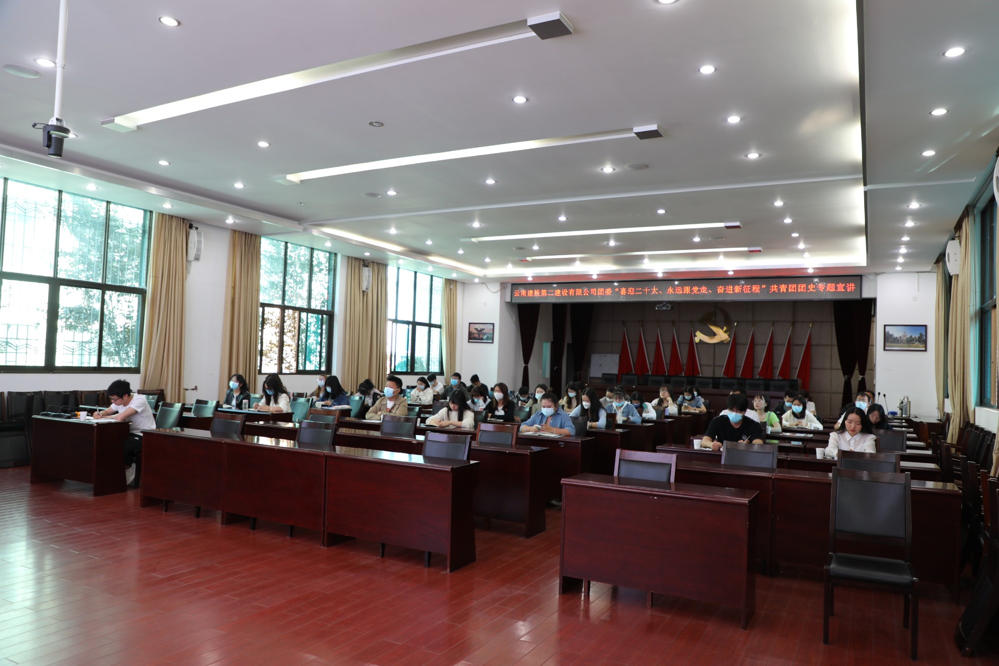 4月27日上午,公司团委在一楼会议室组织开展“喜迎二十大、永远跟党走、奋进新征程”共青团团史专题宣讲,各基层团支部书记、团员代表共计50余人参加培训,培训由公司团委负责人主持。培训还为未能到现场培训的团员同步进行钉钉线上直播。