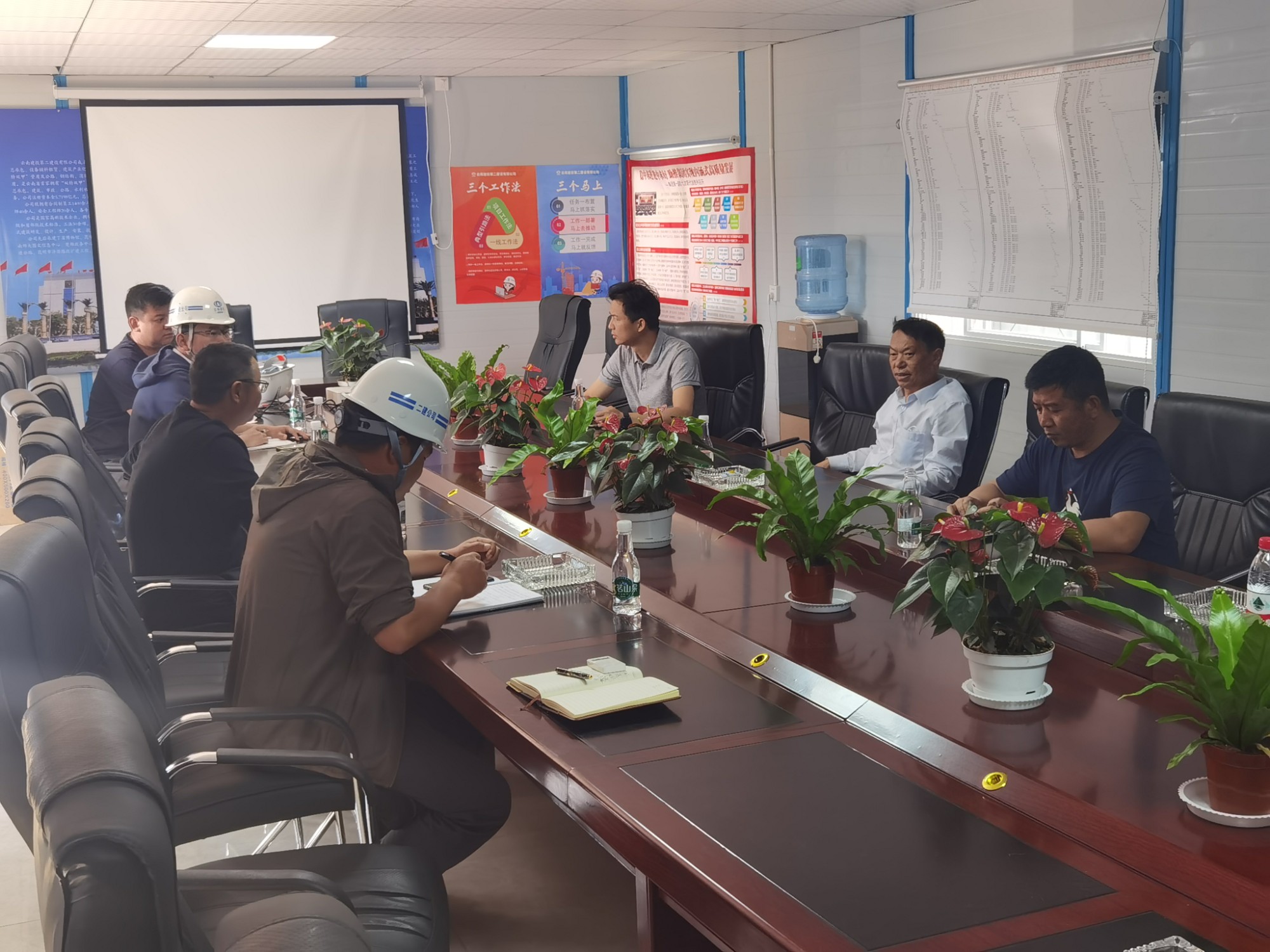 陈定华对项目质量,现场施工安全以及保证工期等方面提出要求:一是学校教学楼区域要在6月30日前完成全部施工内容,工期十分紧张,项目部要做好施工进度安排,保证项目按期完成。二是项目在抓工期进度的同时也要抓质量、保安全,力求优质高效完成项目建设。