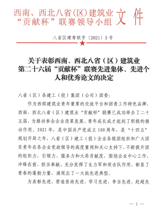 11月2日,西南、西北八省区建筑业第二十六届“贡献杯”联赛正式召开,会上,公司第一安装分公司副经理张平荣获西南、西北八省(区)建筑业第二十六届“贡献杯”联赛“优秀青年项目经理”荣誉称号。