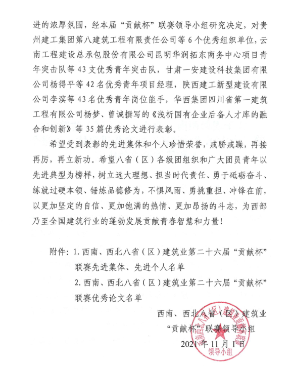 自1984年以来,“贡献杯”联赛已成功举办二十六届,该联赛是西南、西北八省(区)建筑企业共青团组织、青年人的权威赛事,一批批优秀青年通过这个平台脱颖而出。在公司党委高度重视及大力支持下,公司已连续多年在“贡献杯”联赛中斩获佳绩。公司团委作为选树立青年典型的重要抓手,将会继续围绕生产经营为中心任务,规范夯实基础,做实做细团建工作,不断助力企业发展,为企业塑造更加良好的形象,赢得更多荣誉。