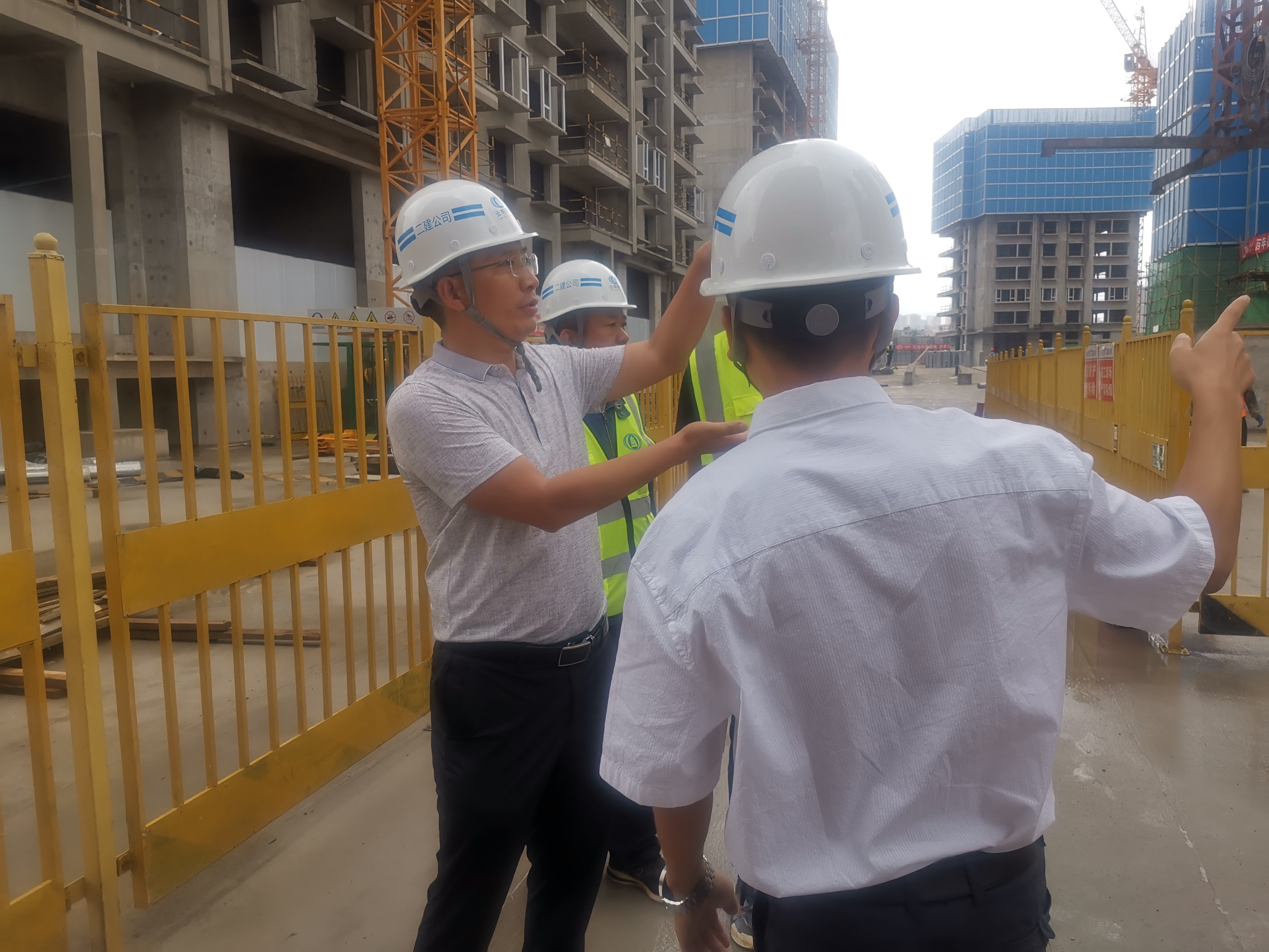付隽苍一行深入施工现场,就现场总平布置情况、无梁楼盖裂缝控制、地下室顶板防水施工质量、室内砌体等进行检查指导,为质量月活动划定会场及现场检查观摩路线。