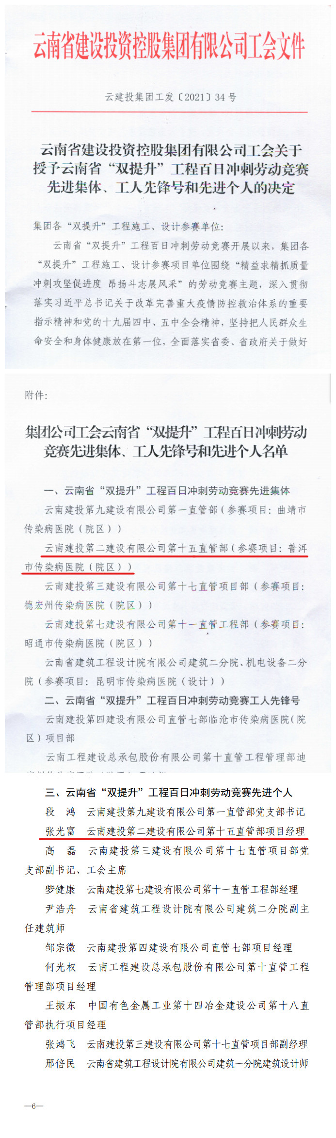 7月5日,集团公司工会印发《云南省建设投资控股集团有限公司工会关于授予云南省“双提升”工程百日冲刺劳动竞赛先进集体、工人先锋号和先进个人的决定》,对在云南省“双提升”工程百日冲刺劳动竞赛中,作出突出贡献的集体和个人进行表彰。公司第十五直管部普洱传染病医院(院区)项目喜获云南省“双提升”工程“先进集体”称号,项目经理张光富喜获“先进个人”称号。