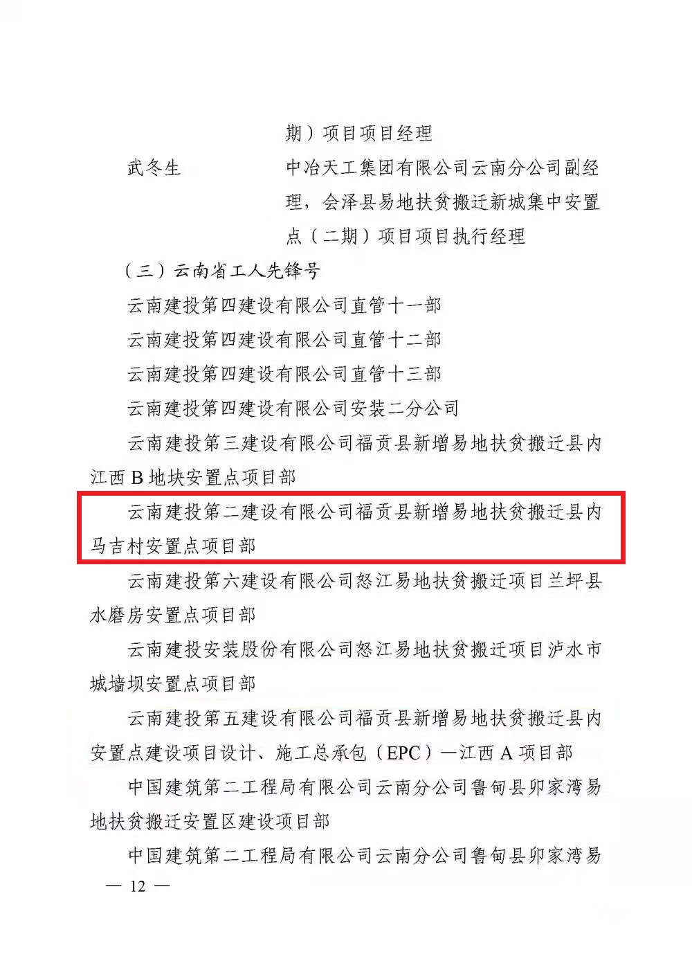 云南省总工会近日对全省易地扶贫搬迁安置工作中作出突出贡献的单位和个人进行了表彰,公司第一直管部承建的福贡县新增易地扶贫搬迁县内马吉村安置点项目部在建期间开展劳动竞赛,成绩突出,获得“云南省工人先锋号”称号。