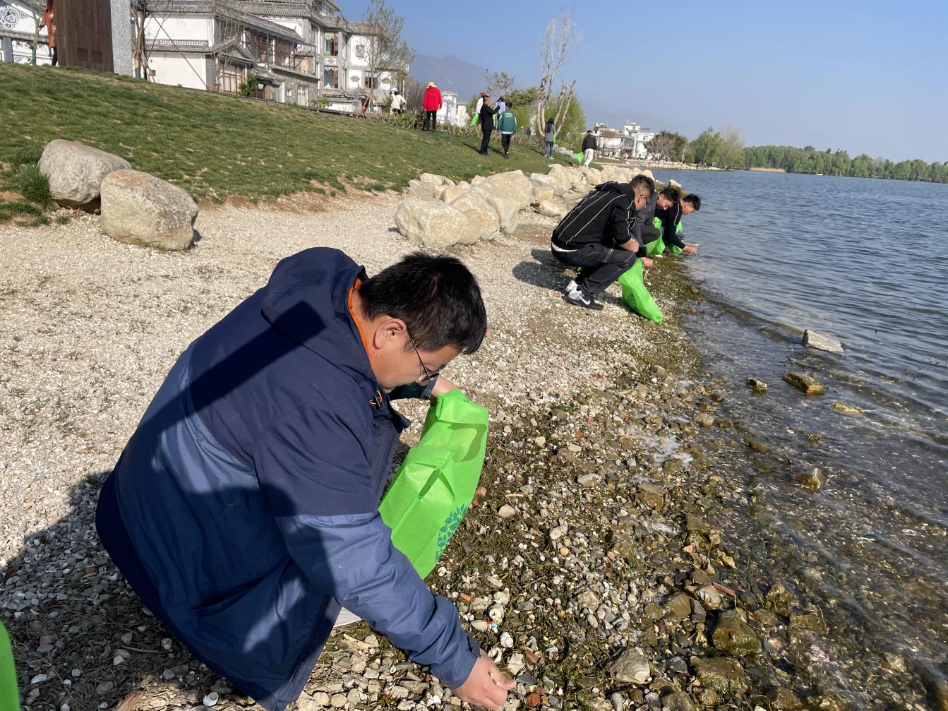 活动当天,在洱海之滨,建投青年志愿者们徒步集团投建的洱海生态廊道,拿着筷子、环保袋等工具,对洱海边的烟头、纸屑进行了清理。天气炎热干劲不减,志愿者们的行动获得了来往游客的纷纷点赞。