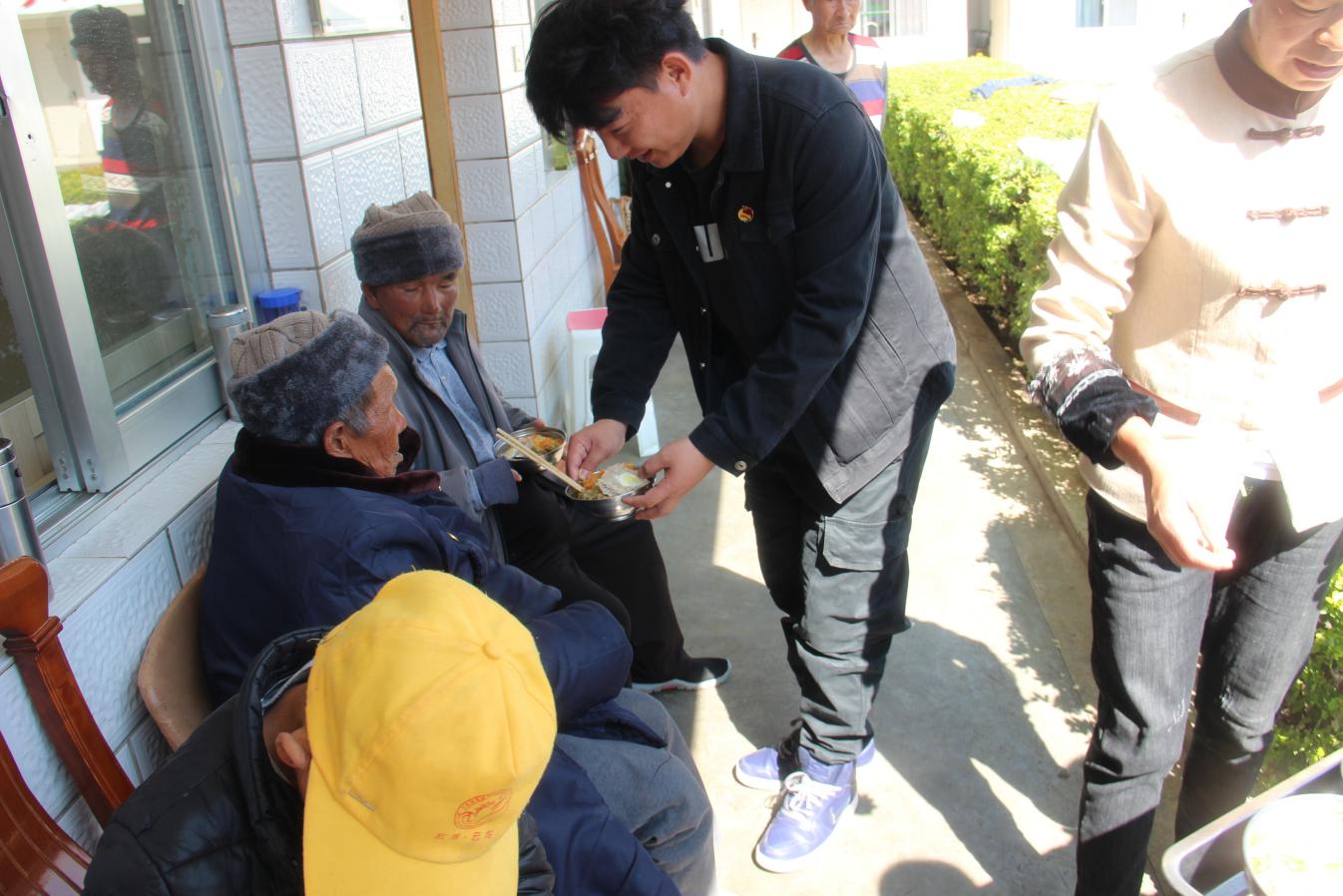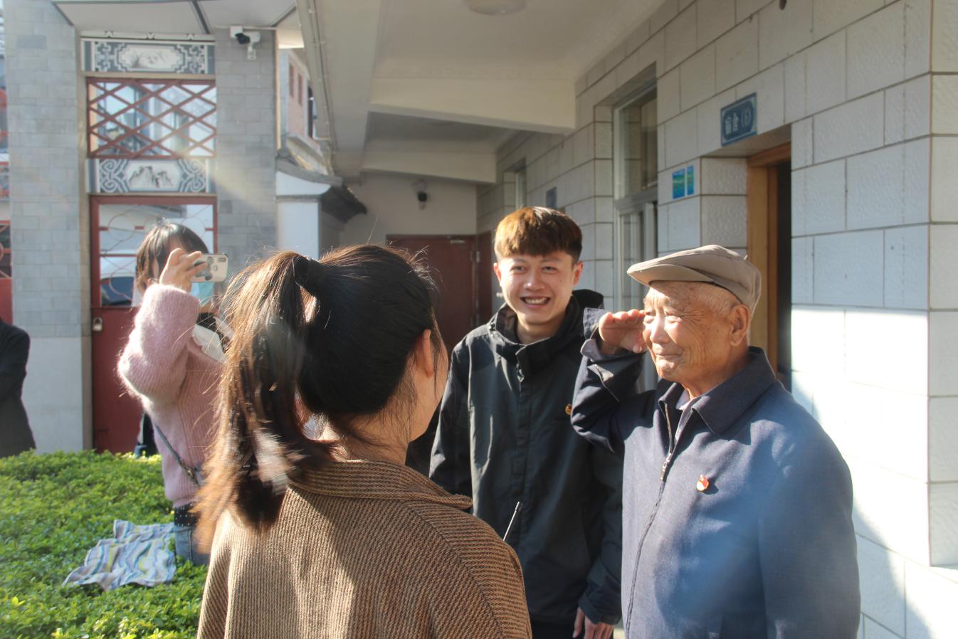 在大理市中心敬老院,志愿者们与老人一同进行晨练广播体操,陪老人散步、晒太阳,聆听百岁老人抗战往事,缅怀历史的同时培养爱国拥军情怀。为帮助老人营造更加舒适的生活环境,志愿者们认真打扫庭院卫生、参与食堂食材准备,为老人们做了一顿美味且有意义的午饭。