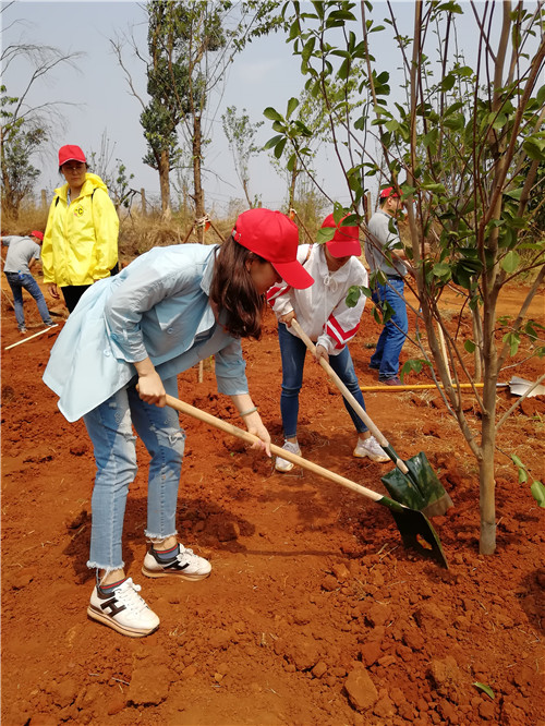 在专业绿化师傅示范植树的方法和步骤后。大家在公司工会主席胡云红的组织下,迅速分为三人一队,领取铁锹、锄头、水桶等工具,各自寻找目标,在高差十来米的坡上、坡下两个种植点,大家分工协作,填土、撑杆、浇水,用了一个多小时种完了136棵冬樱花、100棵玉兰花。并给每棵树都挂上了签着自己名字的责任牌。
