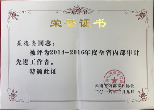 近日,云南省内部审计协会公布了《关于表彰2014-2016年云南省内部审计先进集体和先进工作者的决定》,公司审计部获2014-2016年全省内部审计“先进集体”,公司副总经济师、审计部经理聂德亮获全省内部审计“先进工作者”表彰。